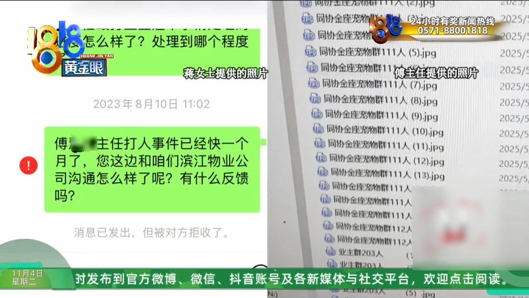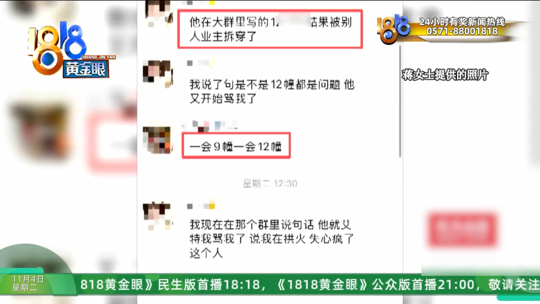 蒋女士:是说是群里的,是那个小区的业主,不认识,没有任何交集。对了,他之前跟物业也是有不满的,然后给了我一个电话,让我去打那个栏目热线,我没打,然后我就把这个人删了。