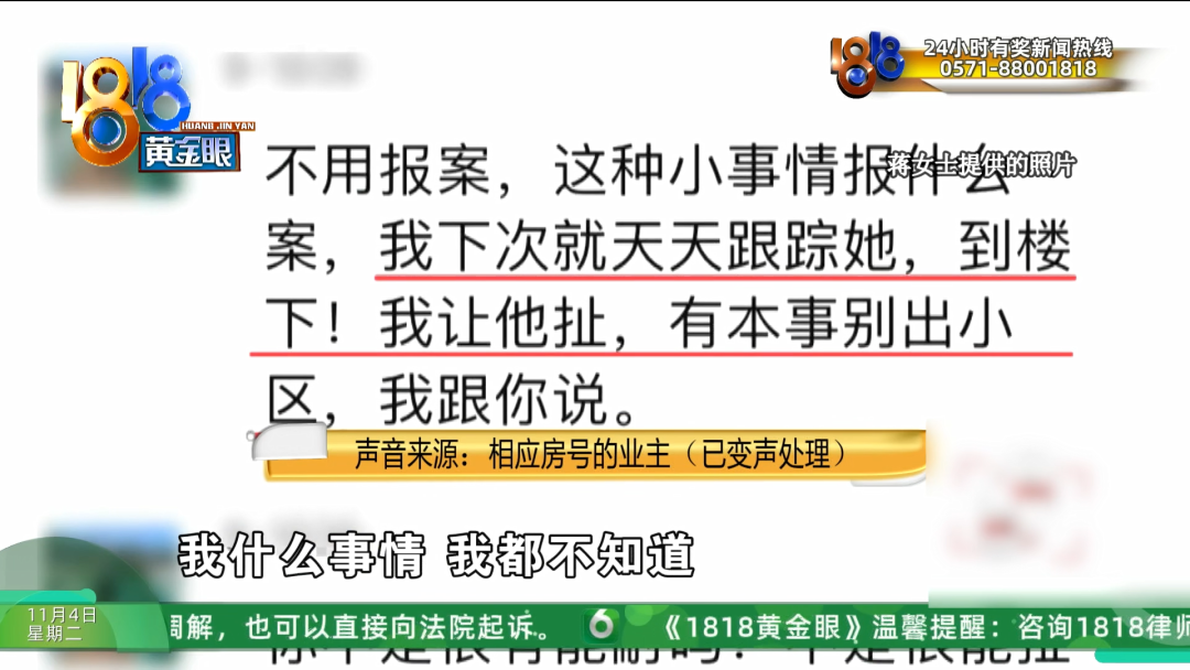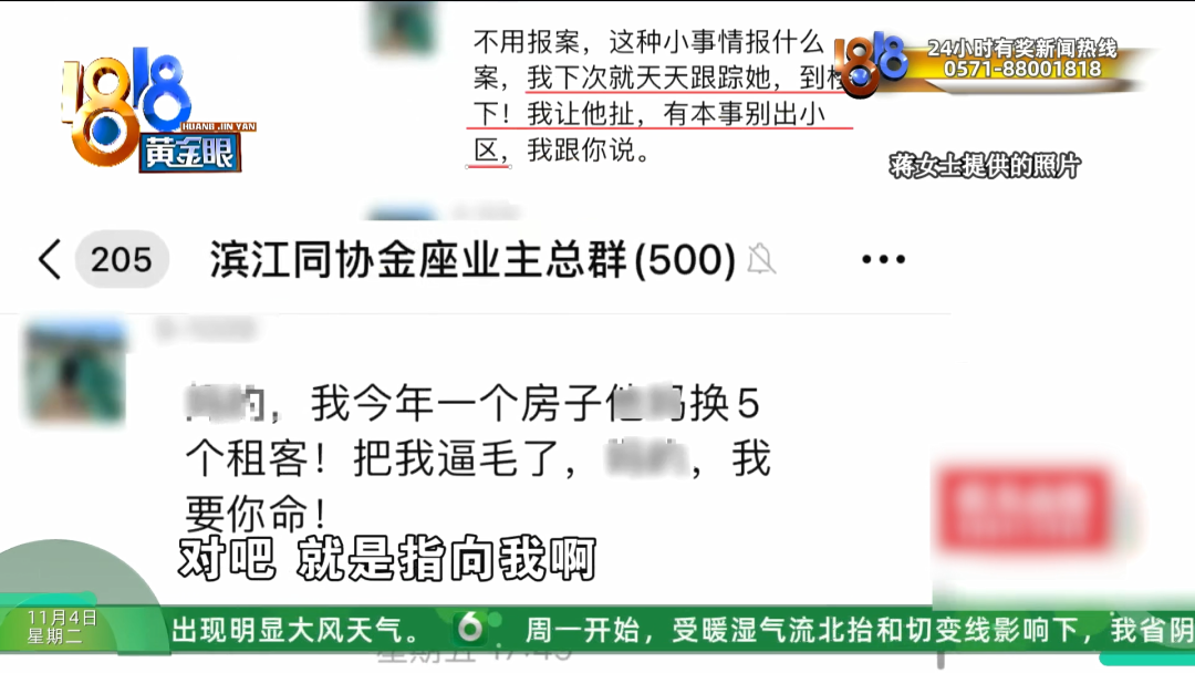 蒋女士:业主群里面已经说,要对我进行跟踪,然后甚至说要我命这种话,那我肯定是要报警的。