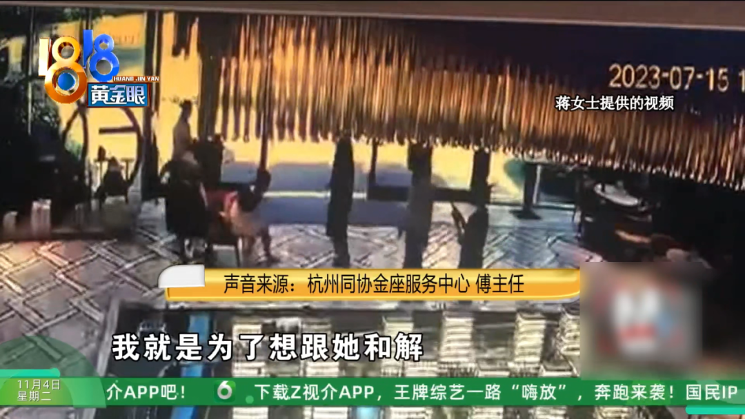 杭州同协金座物业服务中心 傅主任:我是想挡住她手机,我自始至终没有捏到过她的手。她就从凳子上滑下来,说我打她。她在群里、在社交平台不停地在发。那么我第二天我就到派出所去了,因为我本来是当天是想去直接上法院的。
