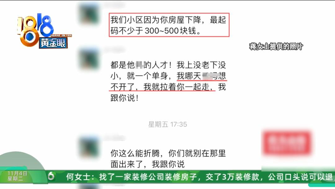 蒋女士:就是物业第一次出了问题,我们想要找它解决,他们不肯解决,然后他们把这个矛盾现在转嫁到业主跟业主之间。物业在周六25号的时候,去上门敲人家业主的门,说让人家看我的社交平台账号,说因为我发了这些东西,然后导致房价下跌,要业主签名,然后联名来起诉我这个人。
